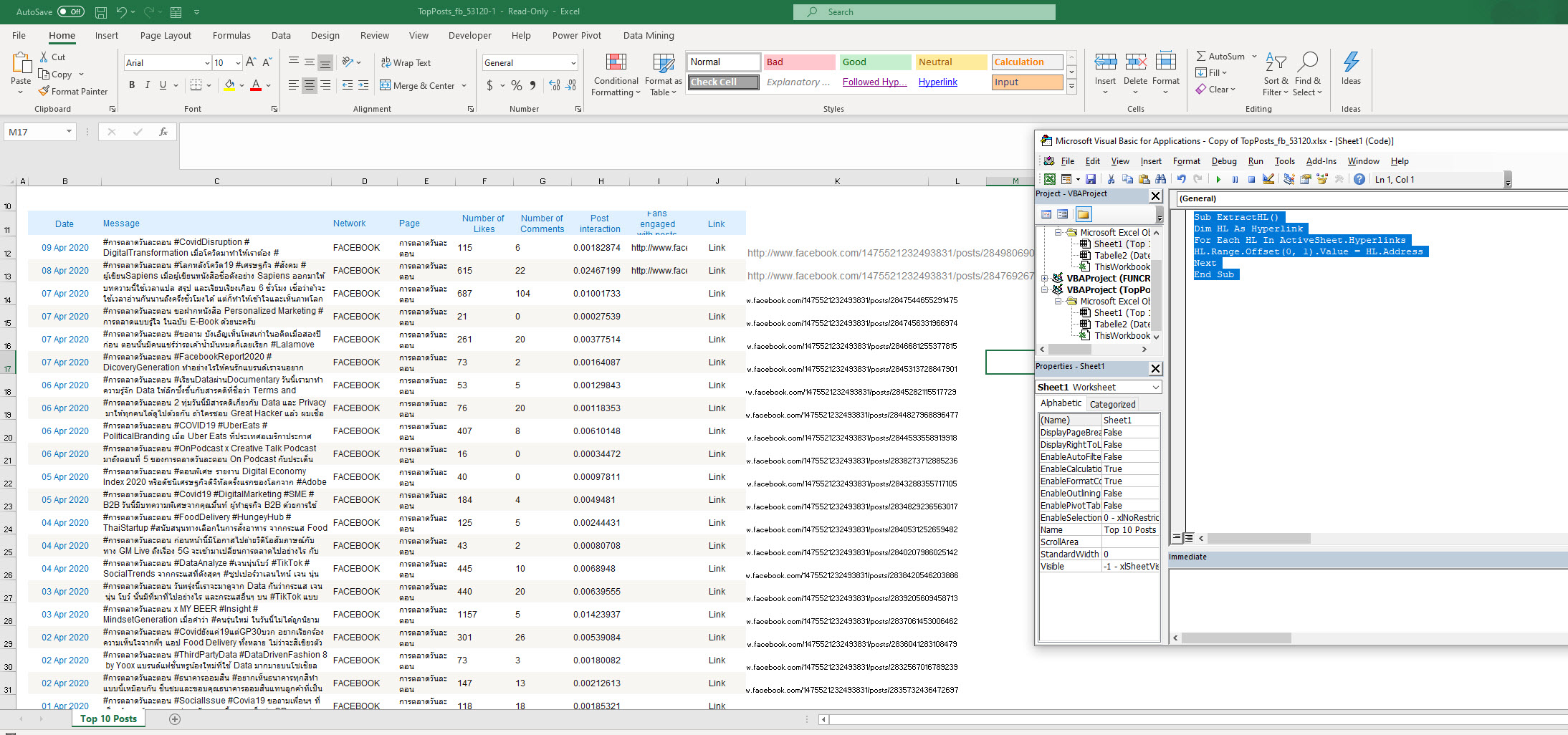 ต้องไปเอา Report จาก Fanpage Kama ที่สามารถ Download มาเป็น Excel Files แต่ติดปัญหา ของ Files ที่ดาวน์โหลดมาและต้องเอาไปใช้งานต่อนั้น ไม่มี Hyperlink แต่ทางเราต้องการ ชื่อ Link ใน Files ที่ Download จะมีวิธีในการทำอย่างไร ?